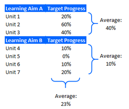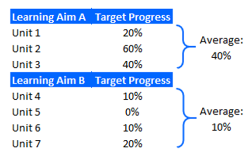 Calculated by taking an average of the target progress for all selected units within the learning aim.