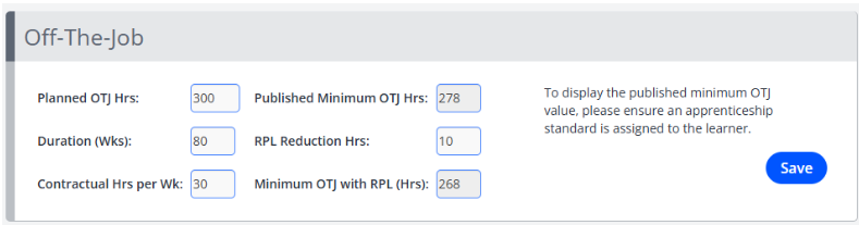 • Minimum OTJT hours are automatically recalculated based on the published DfE value minus recorded RPL.