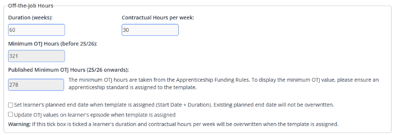 Minimum OTJT hours are now taken directly from the DfE published OTJT calculation table for 2025/26 starts. This ensures Centres are always using compliant and up‑to‑date OTJ values.